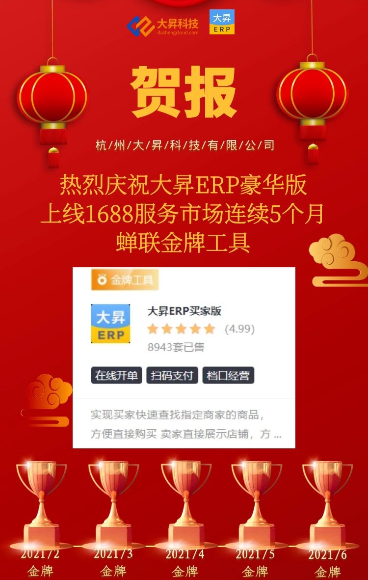 熱烈祝賀大昇erp,憑借客戶喜愛,信賴支持,現(xiàn)已連續(xù)5個(gè)月榮獲1688服務(wù)市場(chǎng)檔口經(jīng)營(yíng)類目金牌工具(后面簡(jiǎn)稱“五冠”),大昇科技旗下產(chǎn)品已不是第一次多月蟬聯(lián)金牌工具。我們堅(jiān)信,有“五冠”,定能拿下“六冠”、“七冠”、“八冠”... ...。我們也相信,憑借優(yōu)秀的團(tuán)隊(duì),過硬的技術(shù),用心的服務(wù),以及客戶的信賴,大昇科技會(huì)稟承初心,繼續(xù)努力,服務(wù)好每一位客戶,對(duì)客戶負(fù)責(zé),對(duì)每一位合作服務(wù)商負(fù)責(zé),也歡迎圈內(nèi)朋友蒞臨公司總部交流合作,共謀發(fā)展! 什么是牌級(jí)體系? 阿里牌級(jí)體系規(guī)則,牌級(jí)是1688服務(wù)市場(chǎng)全新推出的工具能力評(píng)估體系,根據(jù)應(yīng)用工具的四項(xiàng)維度,共計(jì)十項(xiàng)指標(biāo)對(duì)工具進(jìn)行全面評(píng)定,分為金牌、銀牌、銅牌、無牌、萌新五個(gè)牌級(jí),牌級(jí)越高綜合能力越強(qiáng),全方位為您展示應(yīng)用工具的綜合實(shí)力,幫助您快速?zèng)Q策選購(gòu)靠譜工具!