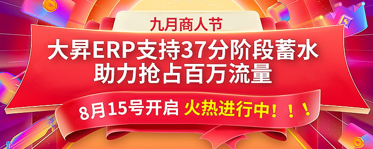2022年,1688月商人節(jié)大促預(yù)熱正式開啟。 大昇erp可以快速下單使用37分階段付款支付方式(不扣手續(xù)費(fèi)),可參與1688平臺蓄水活動, 只要首付款支付完成,訂單總額就計(jì)入9月蓄水活動的營業(yè)額,搶占1688百萬流量。